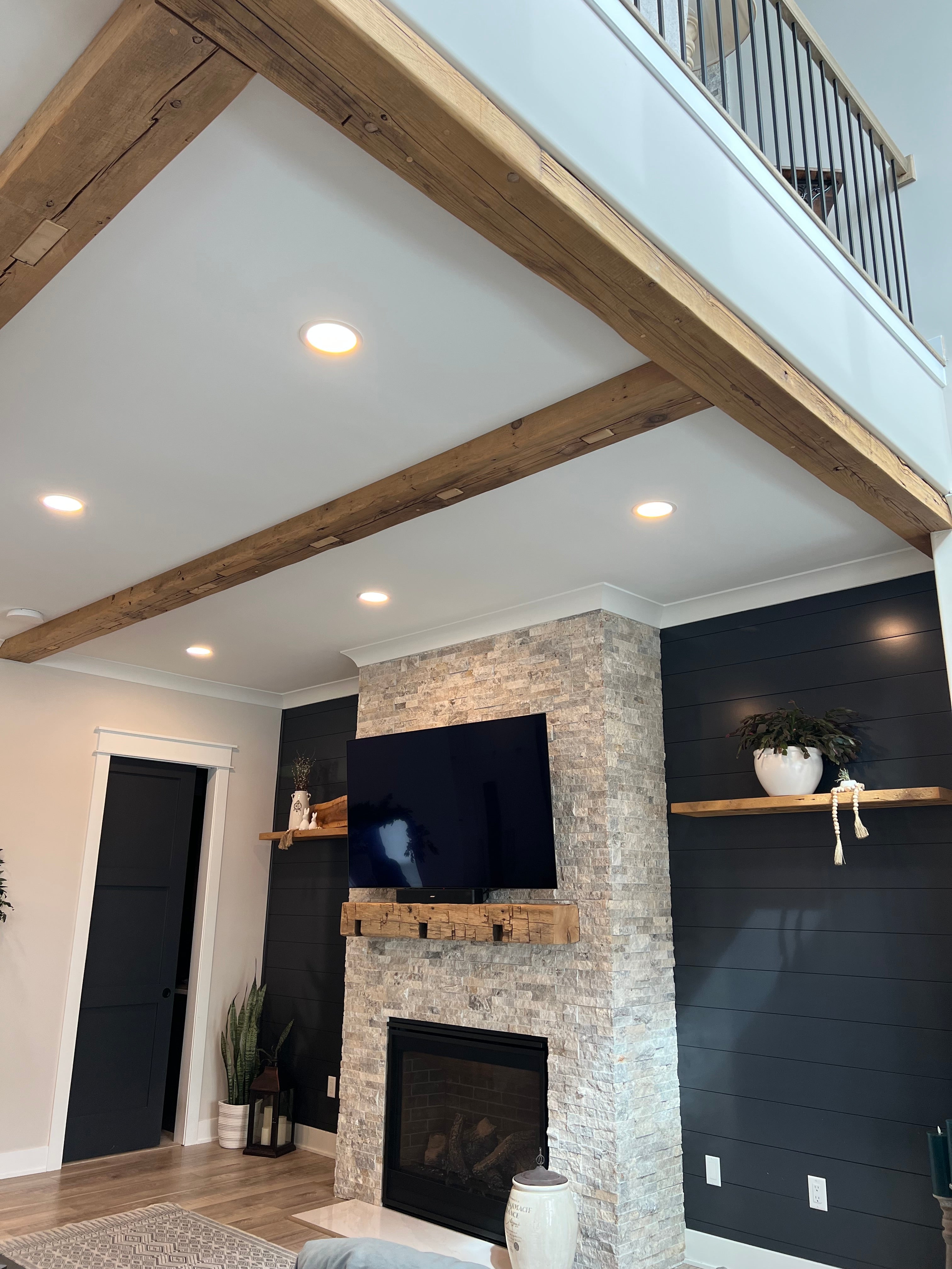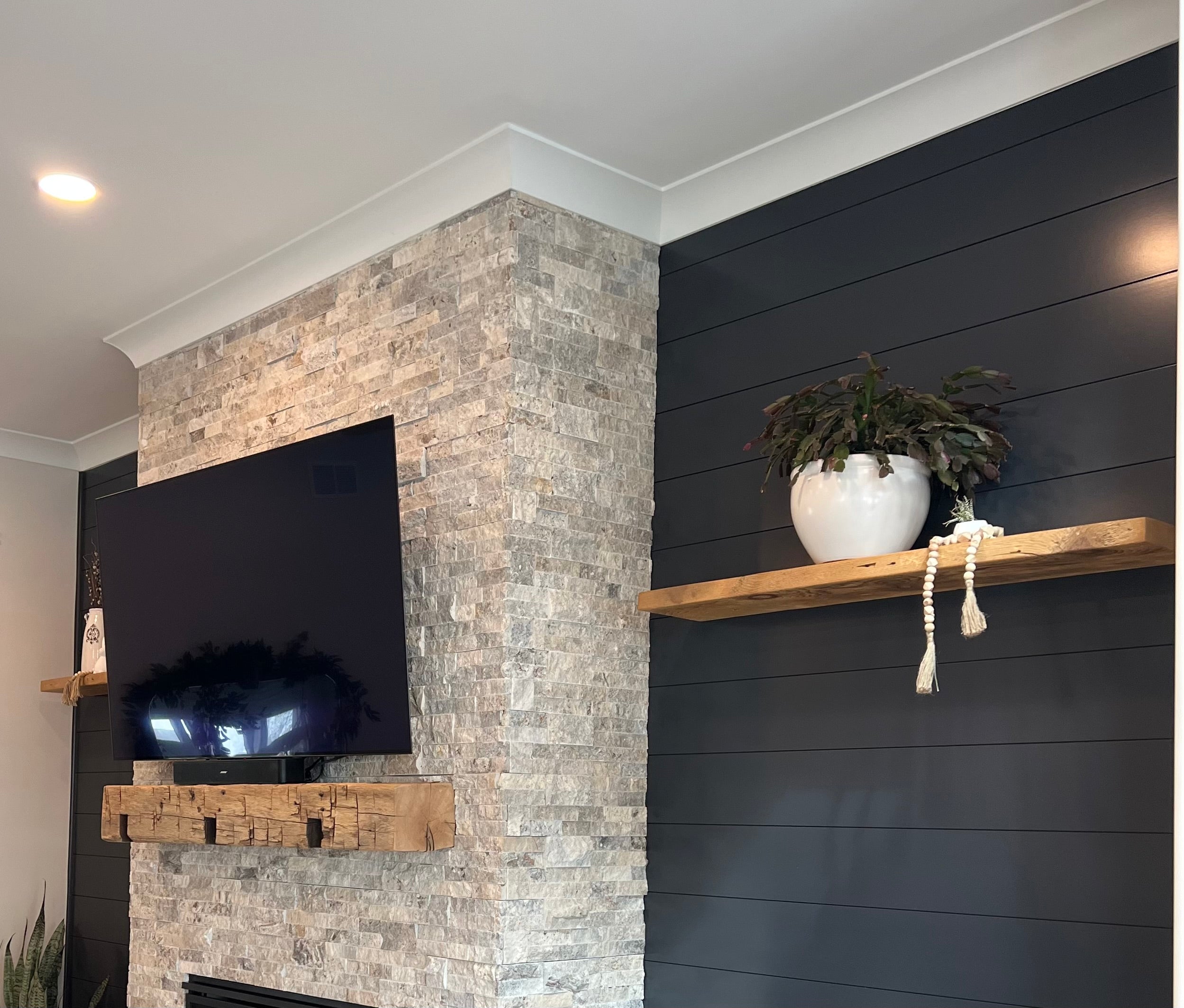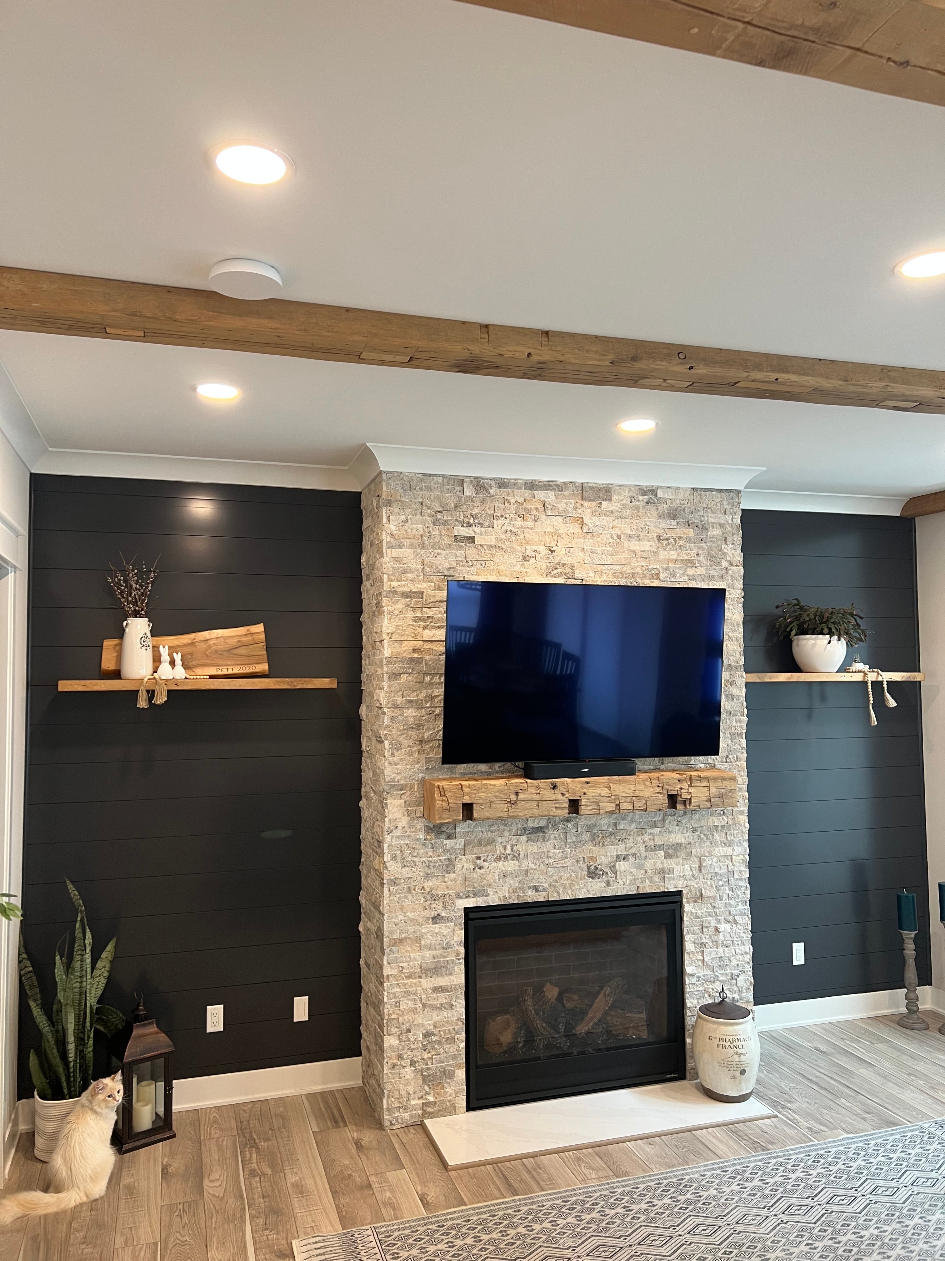 Custom accent wall, counter top, mantle, accent beams and floating shelves...